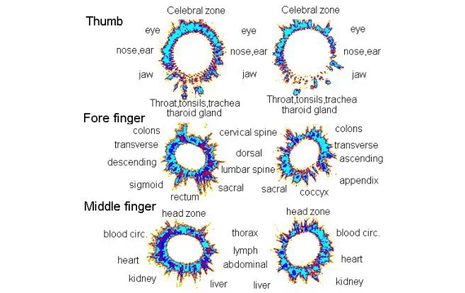 通过克里安照相术揭示每个手指头能量场出现变化与身体各个脏器的状态密切有关: