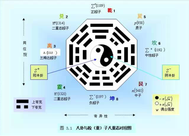 1、 其中有两种夸克——中微子和光子,在绝对静止状态下,它质量是0,它一动要么是+、要么是-,所以,科学家发现的“夸克”几乎同时出现一正一负的“对夸克”。这不禁让我想起老子《道德经》“道生一、一生二、二生三、三生万物”,其中二是指阴阳,三应该是五行(因为元素周期表里面的元素几乎都可以按“金木水火土”分类了),“三生万物”可以理解为这五种基本元素按不同比例的组合就形成了宇宙万物啊!那么“一”是什么呢?没错,当然就是指“0”!还记得佛祖说过“四大皆空”吗?还记得六组说“本来无一物”吗?紧接着——